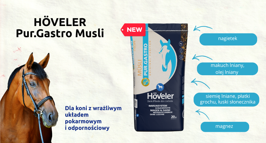 Wejdź, rozejrzyj się. Jesteśmy Twoim partnerem w żywieniu koni hodowlanych, sportowych i rekreacyjnych. Odkryj nasz szeroki wybór musli, granulek, suplementów i nie tylko. U nas znajdziesz bezzbożowe musli dla swojego skoczka, odpowiednie granulki do budowy mięśni u Twojego konia ujeżdżeniowego oraz odpowiedni suplement wspomagający proces linienia. Szukasz tylko smakołyków? Do wyboru są marchewki, banany, jabłka lub słodycze o smaku jabłkowym lub ziołowym. A może wolisz produkty bezzbożowe? W takim razie wypróbuj nasze przysmaki dla koni Pur Stixx lub Gastrolinis.