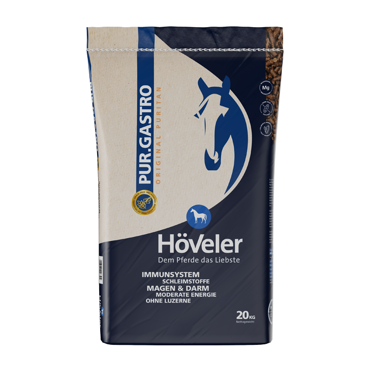 HÖVELER Pur.Gastro może być stosowany zarówno jako pasza pełnoporcjowa, oraz jako uzupełniająca w stosowanej racji żywnościowej. Siemię lniane dostarcza nie tylko niezbędnych kwasów tłuszczowych, ale także śluzu, który łagodzi podrażnienia błony śluzowej żołądka. Wysoka zawartość włókna, wynosząca około 25%, sprzyja również dłuższemu żuciu, a tym samym wydzielaniu zwiększonej ilości śliny. Wodorowęglan sodu zawarty w ślinie buforuje kwas żołądkowy.Dzięki starannie dobranym, wysokiej jakości składnikom HÖVELER Pur.Gastro jest idealną paszą dla koni z wrażliwym przewodem pokarmowym.