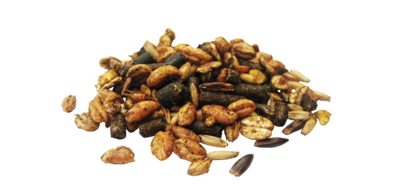 Owies, jęczmień spęczniały, lucerna, prażona kukurydza bez GMO, melasa trzcinowa, łuski orkiszu, śruta pszenna, prażona poekstrakcyjna śruta sojowa bez GMO, płatki soi  bez GMO, poekstrakcyjna śruta słonecznikowa, jęczmień, olej sojowy bez GMO, węglan wapnia, chlorek sodu, tlenek magnezu, drożdże piwne, CellProtect